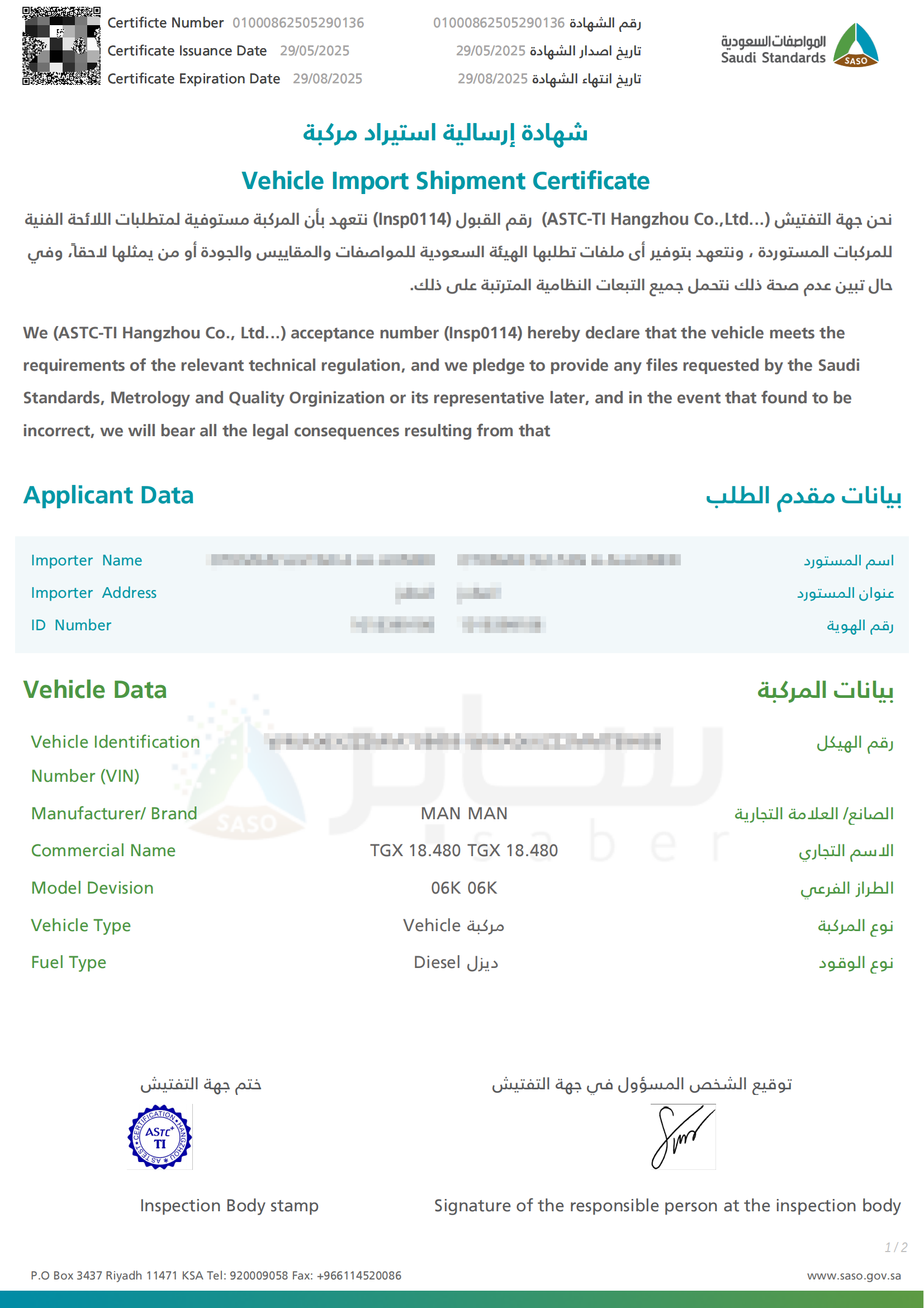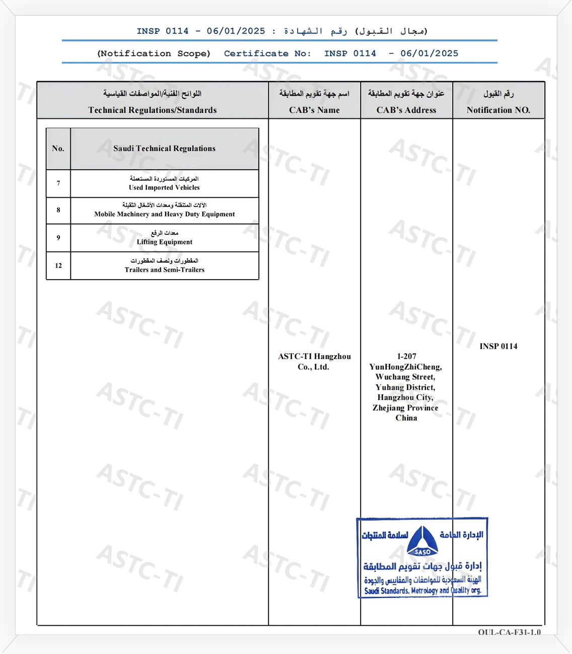 ASTC-TI has been officially authorized by the Saudi Standards, Metrology and Quality Organization (SASO) as a designated inspection body. It can conduct inspections on used vehicles imported into Saudi Arabia and issue Saber inspection certificates.
